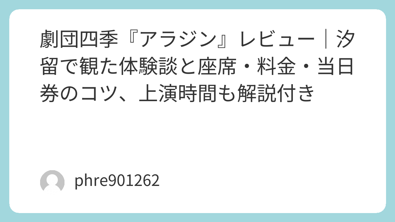 映画で知ってる物語だから安心だろう、くらいの気持ちで汐留へ行ったら、想像よりずっと“舞台の魔法”が強かった。劇団四季の『アラジン』は派手に笑わせておいて、最後は静かに胸を締めてくる。初めてのミュージカルでも置いていかれないテンポ感があるのに、余韻だけはしっかり残るタイプだった。