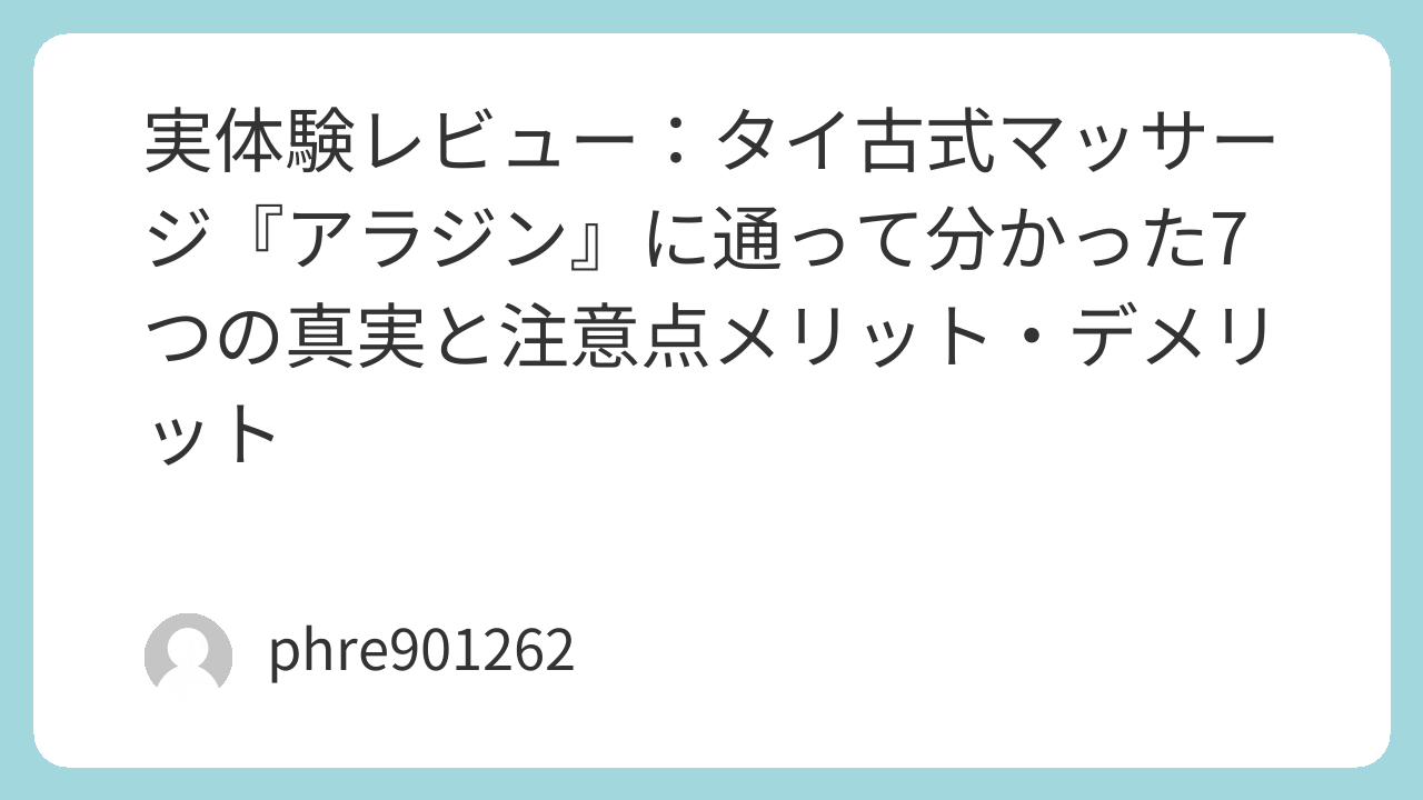 総括すると、タイ古式マッサージ「アラジン」は、しっかり体を伸ばして可動域を取り戻したい人、慢性的なコリを根本から変えたい人に向いている。施術者との相性と強さのコミュニケーションが鍵なので、初回は短めの時間で様子見をして、自分に合うセラピストを見つけるのが得策だ。