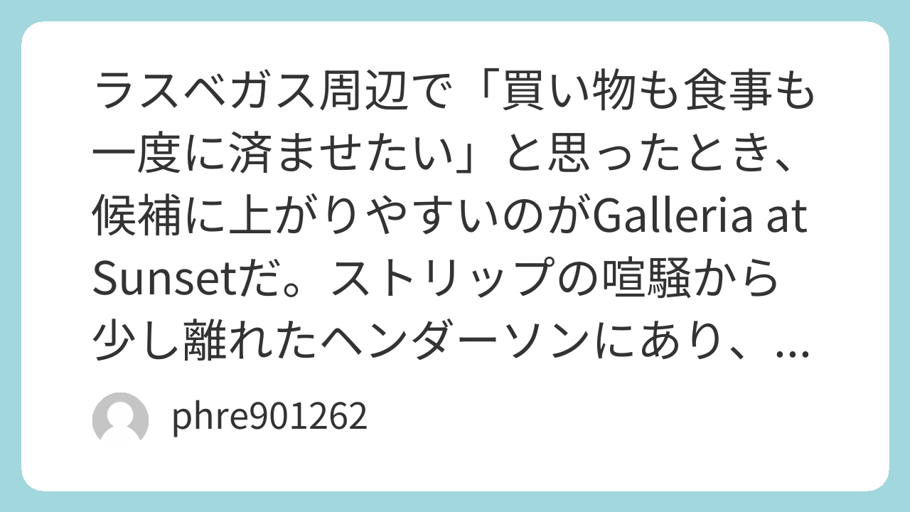Galleria at Sunsetは、派手さよりも「使い勝手の良さ」で満足度を積み上げてくれるモールだ。歩きやすい装備で挑み、荷物を増やしすぎず、スマホの充電に余裕を持つ。それだけで、買い物も食事もストレスなく回れて、ラスベガス滞在の一日がきれいに整う。観光の合間にサクッと寄るにも、夕方からごはん込みで楽しむにも、ちょうどいい選択肢になってくれるはずだ。
