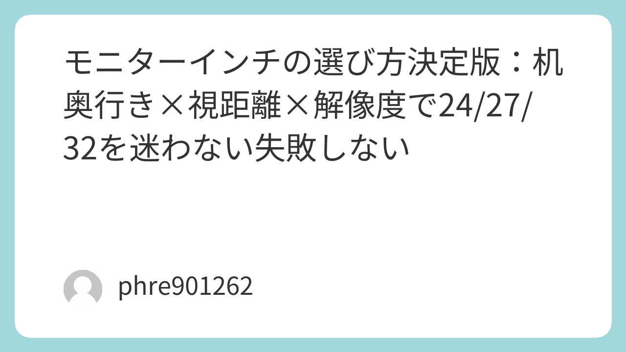 最後に、迷ってる人向けの決め方を一言でまとめる。奥行き60cmなら24〜27で、27を置くならアームや配置で距離を稼ぐ。奥行き70cm以上なら27が安定で、32は“距離が取れるなら最高”枠。解像度は24=FHD、27=WQHD、32=4Kを基準にするとブレない。インチ選びは「置ける距離を確保できるか」でほぼ決着がつく。そこさえ押さえれば、買ったあとにモヤモヤしない。