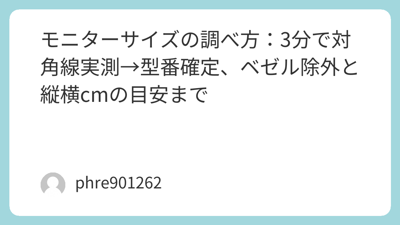 モニターの「サイズ(○インチ)」は、基本的に画面の対角線で決まります。まずここを押さえれば迷いが減る。理由は、外枠(ベゼル)やスタンドの大きさは機種ごとにバラバラで、数字として比較できないから。補足すると、箱なし中古でもこの考え方でちゃんと辿り着けます。
