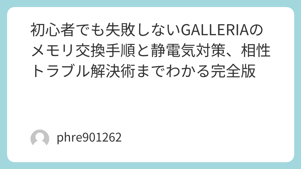 GALLERIAのメモリ交換は、手順自体は素直でも、規格違いと半刺しと相性でつまずきやすい作業です。DDR世代とDIMM/SO-DIMMを先に確定し、静電気対策を入れて丁寧に装着し、最後に検査で安定性を確認する──この流れを守れば、初めてでも高確率で成功へ持っていけます。ゲームの快適さを手っ取り早く底上げしたいなら、メモリ交換はかなりコスパの良い一手になります。