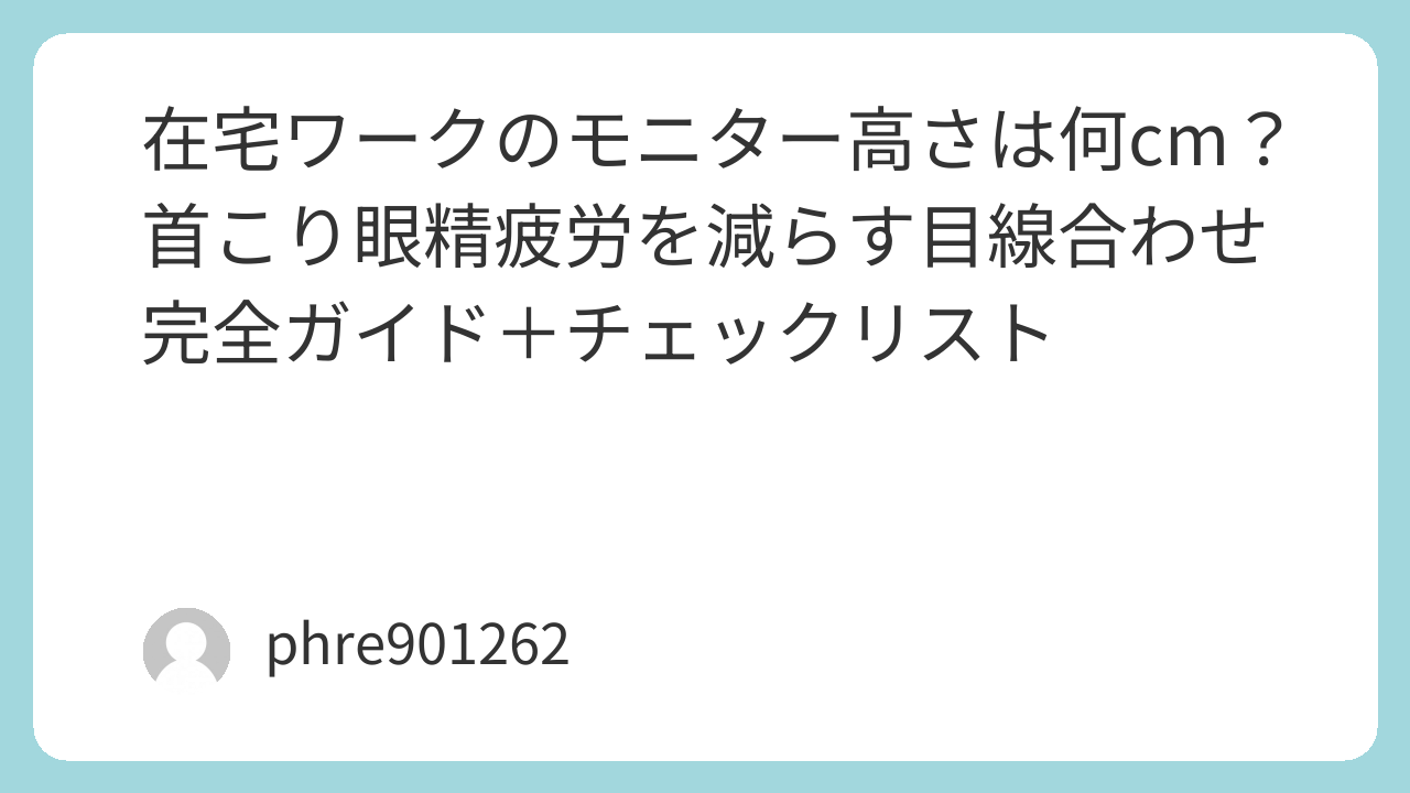 最後に、今日すぐ見直すチェックだけ置いておく。画面上端が目の高さ付近、顎が上がらない、肩がすくまない、画面までの距離が近すぎない。この4つが揃うと、作業の終わりに残る疲れが減る。合わない日は、いきなり大きく変えずに1〜2cmだけ動かして様子を見る。地味だけど、それが一番戻りが少ない。