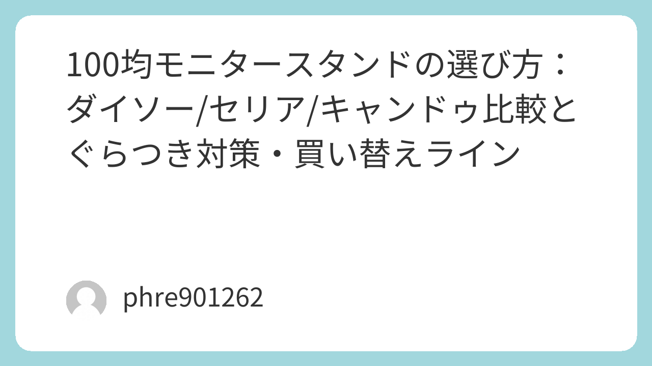 100均のモニタースタンドは、軽めの環境ならちゃんと役に立つ。とはいえ、重さや揺れに違和感が出たら早めに方向転換したほうが気が楽だ。机上台で整えるならサンワサプライ モニター台 https://www.amazon.co.jp/s?k=%E3%82%B5%E3%83%B3%E3%83%AF%E3%82%B5%E3%83%97%E3%83%A9%E3%82%A4+%E3%83%A2%E3%83%8B%E3%82%BF%E3%83%BC%E5%8F%B0&tag=opason-22 を眺めつつ、ノートPCの高さ調整も気になるならエレコム PCA-LTSH8BK https://www.amazon.co.jp/s?k=%E3%82%A8%E3%83%AC%E3%82%B3%E3%83%A0+PCA-LTSH8BK&tag=opason-22 やBoYata ノートパソコンスタンド https://www.amazon.co.jp/s?k=BoYata+%E3%83%8E%E3%83%BC%E3%83%88%E3%83%91%E3%82%BD%E3%82%B3%E3%83%B3%E3%82%B9%E3%82%BF%E3%83%B3%E3%83%89&tag=opason-22 まで視野に入れる。最初は小さく試して、気持ちよく作業できる形に寄せていこう。