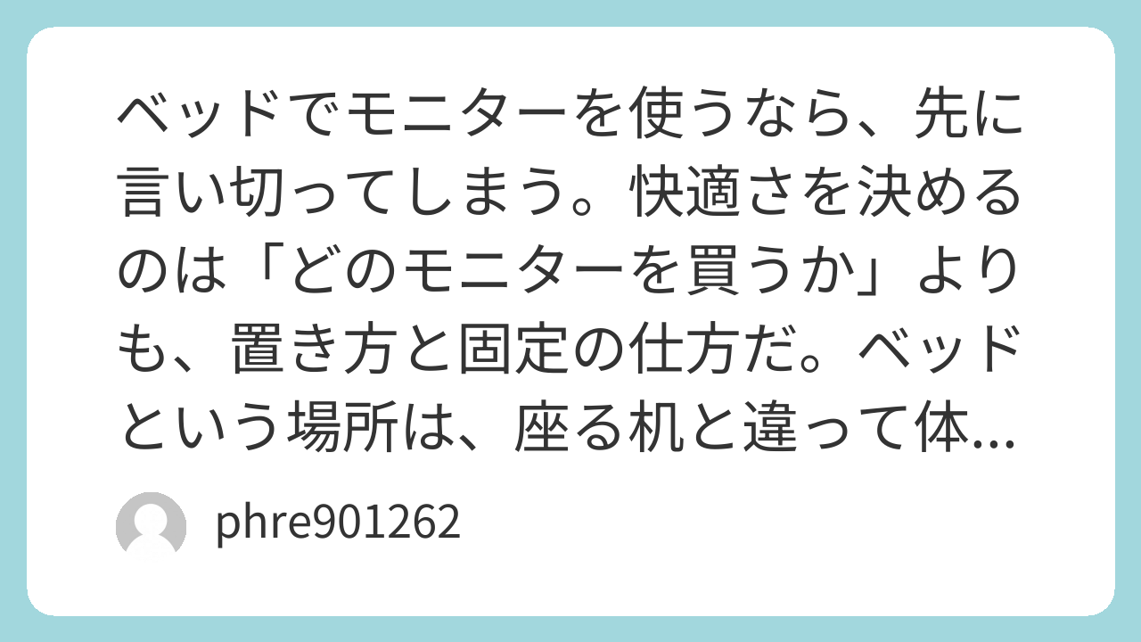 自分が最初につまずいたのは「とりあえずベッド脇の台に置く」だった。距離が近くなって、画面を覗き込む姿勢になりやすい。最初は楽でも、30分くらいで首の付け根が固まってくる。しかもベッドは寝返りもするから、ケーブルが引っ張られて位置がズレる。モニターを見るというより、モニターに合わせて体をねじる感じになる。ここで気づく。ベッド用は“体を固定する”じゃなく“画面を寄せる”ほうがラクだ。