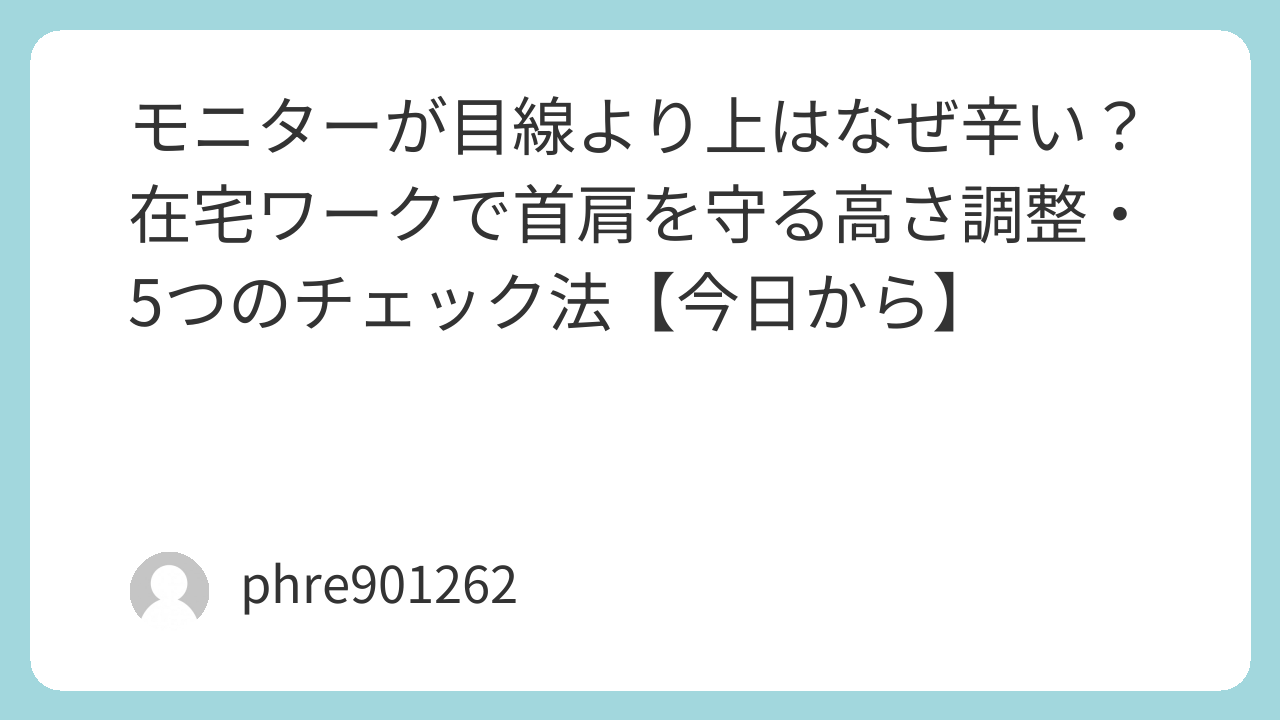 在宅で作業していて「モニター、なんか高いな」と感じたら、それはだいたい当たり。結論から言うと、メイン画面が目線より上になりすぎる配置は、首肩がつらくなりやすい。理由はシンプルで、視線を上げるたびにあごが上がり、首の後ろ側が常に踏ん張る形になるから。補足すると、短時間なら気づきにくい。30分〜1時間でじわっと効いてくるタイプの疲れだ。