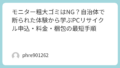 モニターの接続端子は、今日つながるかだけじゃなく、次に買うPCやゲーム機で快適さが変わります。迷ったら、HDMIとDPが両方あるモニターにしておくと逃げ道が増える。ノートPCをメインにするなら、USB-C周りは“映像が出る前提”でケーブルとハブを固める。ここを押さえるだけで、「映らない」系のトラブルに使う時間が一気に減ります。