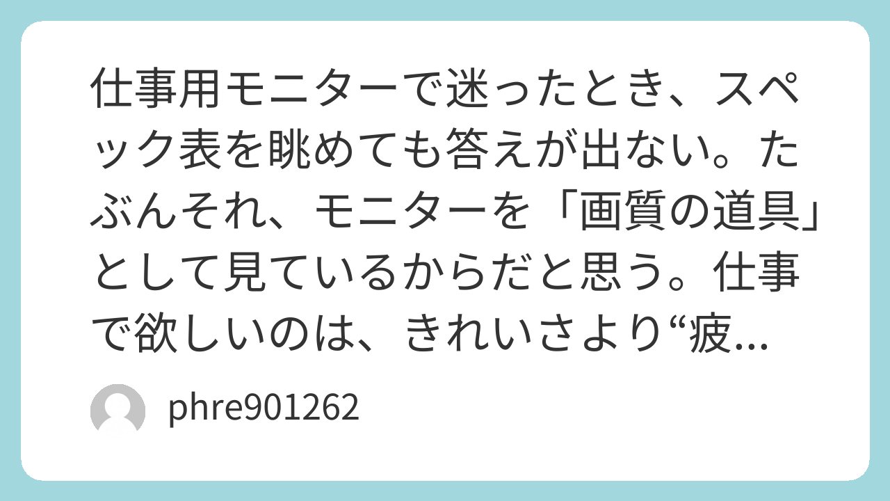 仕事用モニター選びは、画質を追いかけるほど迷う。疲れないこと、切り替えが速いこと、姿勢が崩れないこと。この順に整えると、自然に答えが出る。最終的に、あなたの仕事が一番つらい瞬間――「目がしょぼしょぼする」「首が固まる」「切り替えが面倒」――そこを一個ずつ潰せる構成にすると、買い物の後悔が減る。モニターは“作業の道具”だから、気持ちよく使える方が正解だと思う。