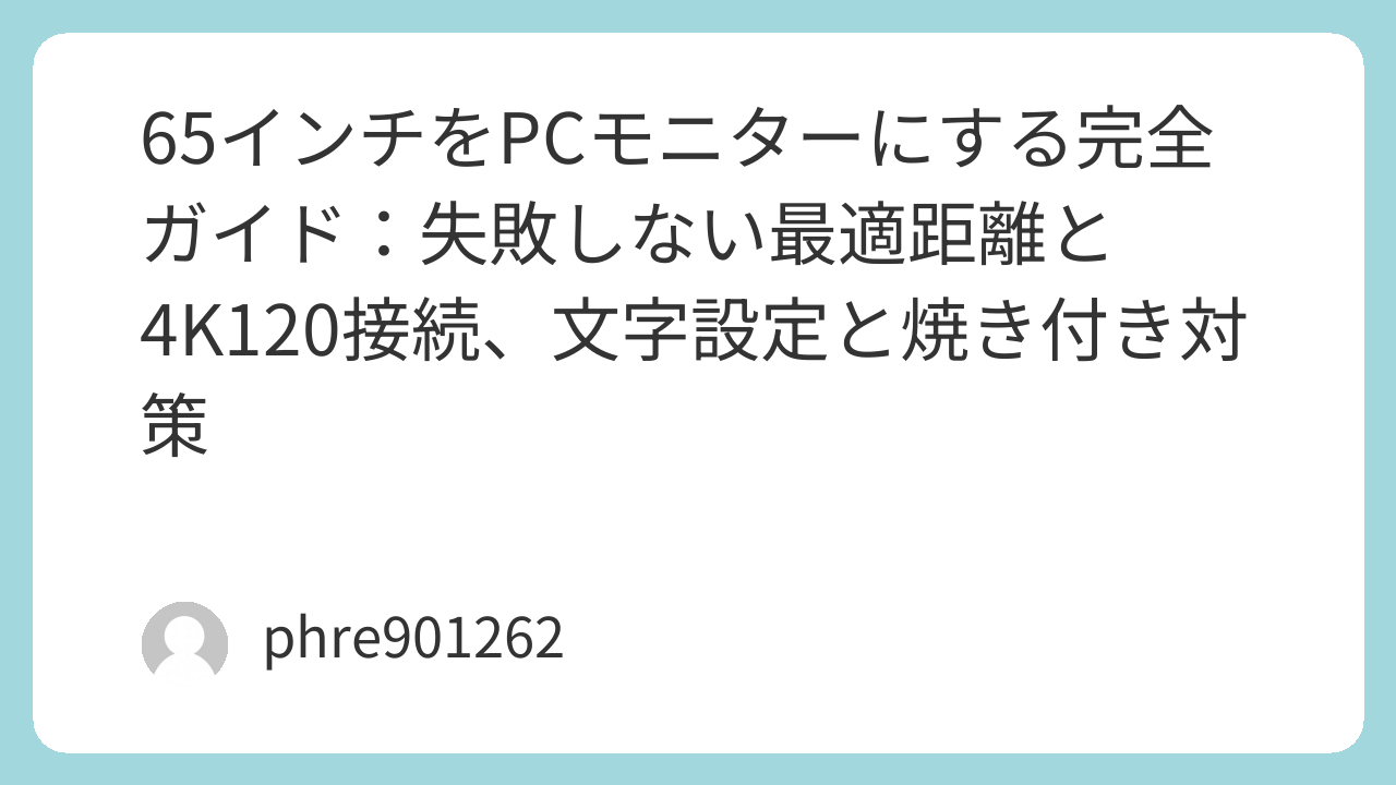 65インチモニター化は、性能の前に設置距離。次に4K120の接続(ケーブルと設定)。最後に文字が読みやすい画作り。ここを押さえると、65インチは「大きいだけ」じゃなくて「生活が変わる大画面」になる。逆にこの3つを雑にすると、スペックが良くても違和感が残る。じわじわ来るのは首と目だから、最初にラクな形を作ってしまうのが一番早い。