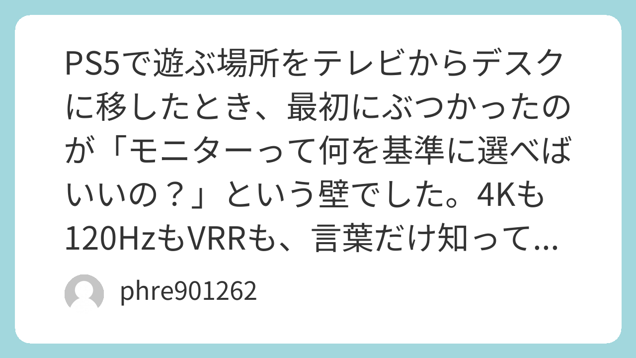 PS5で遊ぶ場所をテレビからデスクに移したとき、最初にぶつかったのが「モニターって何を基準に選べばいいの?」という壁でした。4Kも120HzもVRRも、言葉だけ知っていても、いざ買う段階になると迷子になりやすい。結論から言うと、プレステ用モニターは“自分が何を気持ちよくしたいか”で最適解が変わります。そこを外さなければ、買ってからの後悔はかなり減ります。