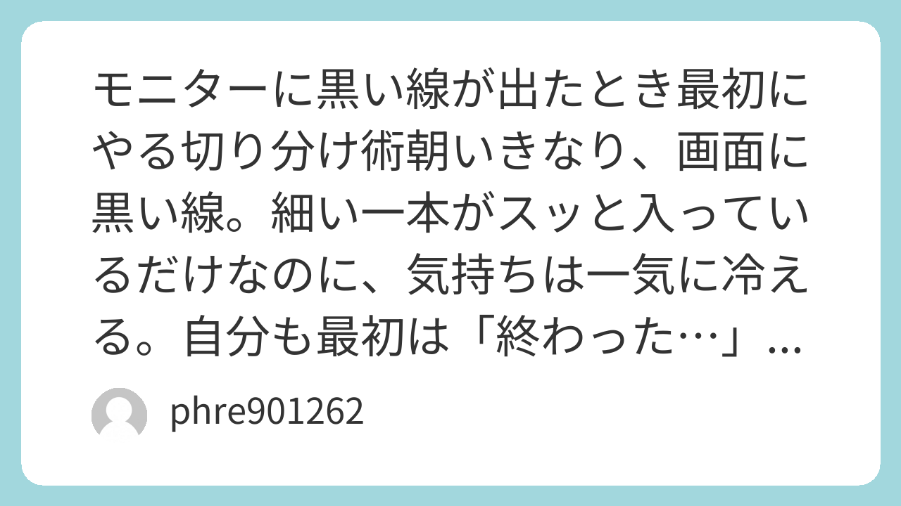 黒い線は、運が悪い故障のサインにもなるし、ただの接触不良のサインにもなる。だからこそ、焦りながらも順番だけは崩さない。スクショ判定→セルフテスト→ケーブル交換→別機器接続→設定調整。この流れでやると、原因が見える。見えたら、次の一手も決まる。