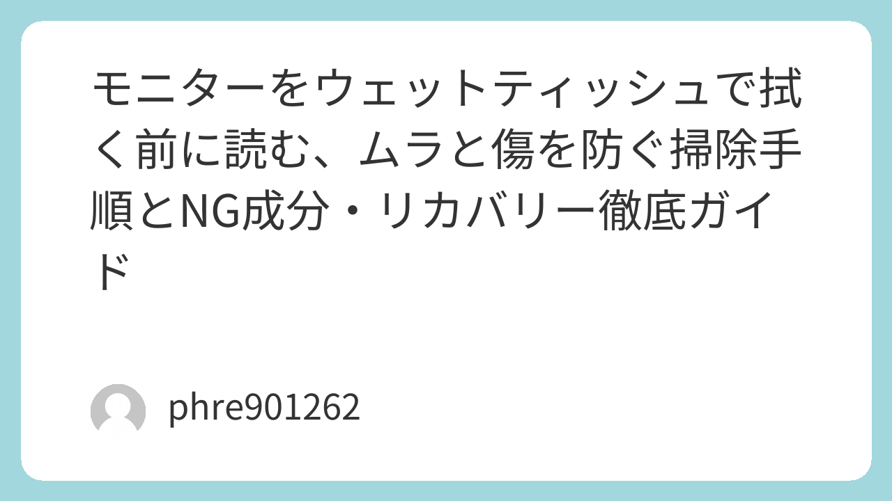 モニターをウェットティッシュで拭くのは、基本は避けたほうがきれいが長持ちする。理由は、ムラ・筋・コーティング負担のリスクが、手軽さのメリットを上回りやすいから。どうしてもという場面でも、まずホコリを飛ばして、乾拭きで済むか確かめて、それでも無理なら“少し湿らせたクロス”に寄せる。この順番だけ守ると、画面掃除の失敗がかなり減る。