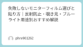 すでにグレアを買ってしまった、会社支給で変えられない。そういうときはフィルムで近づける方法もある。ただ、フィルムは“マットを足す”ので、白っぽさが増えたり、細部が少し甘くなることがある。貼りムラや気泡が出ると、逆に目が疲れる場合もある。