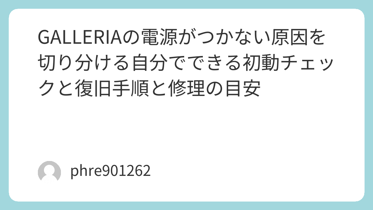 電源がつかない問題は、派手な故障に見えても“外側の単純な原因”が混じるのが厄介です。壁コンセント直挿しから始め、最小構成、接触不良の解消、電源系の検査へと段階を踏めば、手戻りなく原因に近づけます。慌てず順番通りに進めることが、GALLERIAを安全に復旧させるいちばんの近道です。