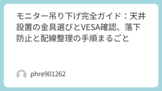 モニターを吊り下げると、机の上が一気に広くなる。スタンドの脚が消えるだけで、キーボードも書類も置きやすいし、掃除もラク。見た目もスッキリする。だからこそ人気なんだけど、実際にやろうとすると「金具を買えば終わり」じゃない。先に確認すべきことが...