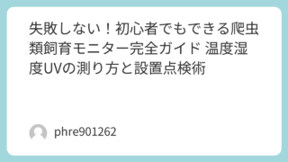 爬虫類飼育でいちばん怖いのは、じわじわズレた環境に気づけないこと。見た目は元気でも、温度が低いまま消化が止まったり、乾燥で脱皮が荒れたり、UVが届かずに骨が弱っていったりする。だから「モニター(監視)」が要になる。結論はシンプルで、温度・湿...