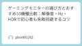 (体験)PC側で解像度をいじって迷走してたのに、モニター側が「表示領域:オート」で勝手に引き伸ばしていた、ということがありました。まずOSDを触るの、地味に効きます。