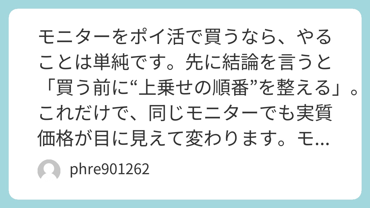 モニターは単価が高いぶん、ポイ活の差が出やすい買い物です。だからこそ、テクニックより先に「順番」を固めるのが一番効きます。