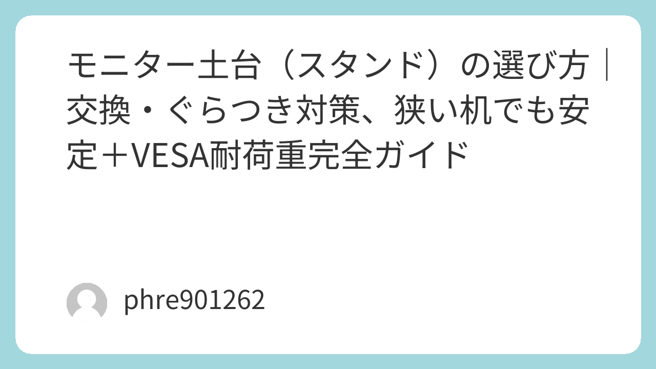 モニター土台は、見た目の問題に見えて、実は姿勢と集中力に直結する。VESA寸法、ネジ、耐荷重、机の条件。この順にチェックして選べば、ぐらつきや邪魔さはかなり減る。