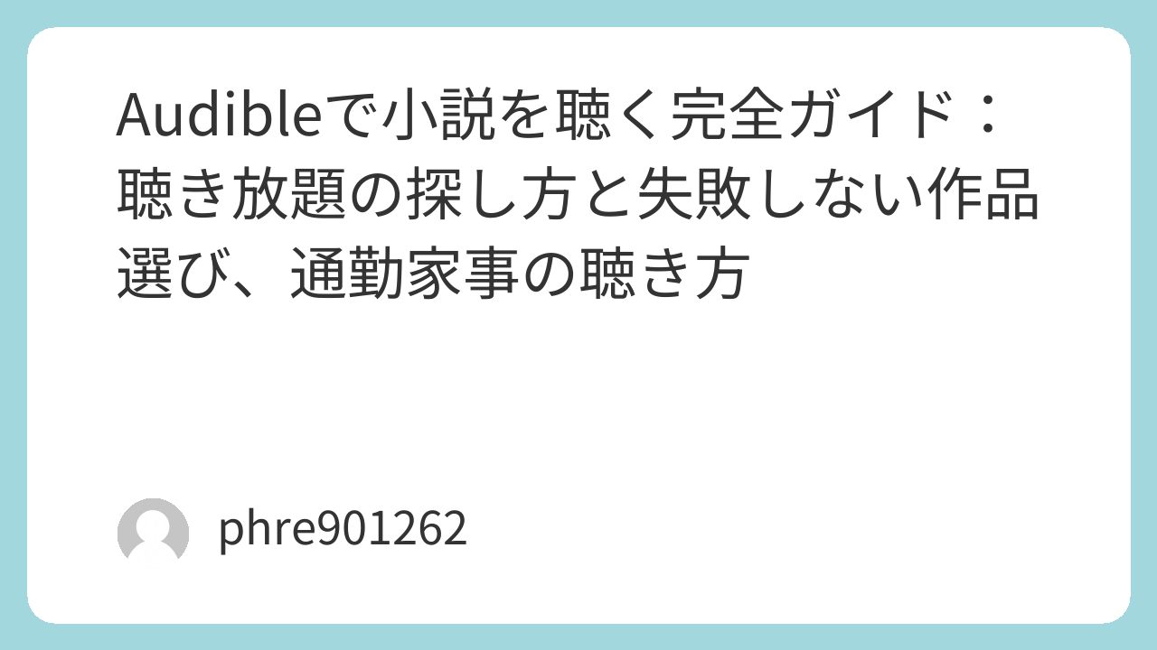 Audibleで小説を楽しむコツは、作品の選び方を難しくしないこと。カテゴリから入り、人気順で試聴して、声とテンポが合うものを1本選ぶ。あとは聴くシーンに合わせて道具を整えるだけです。通勤ならノイズキャンセリング、家事なら耳を塞がないタイプ、家の中はスピーカー。こうして“生活の中で勝手に進む読書”ができると、気づいたら一冊終わっています。