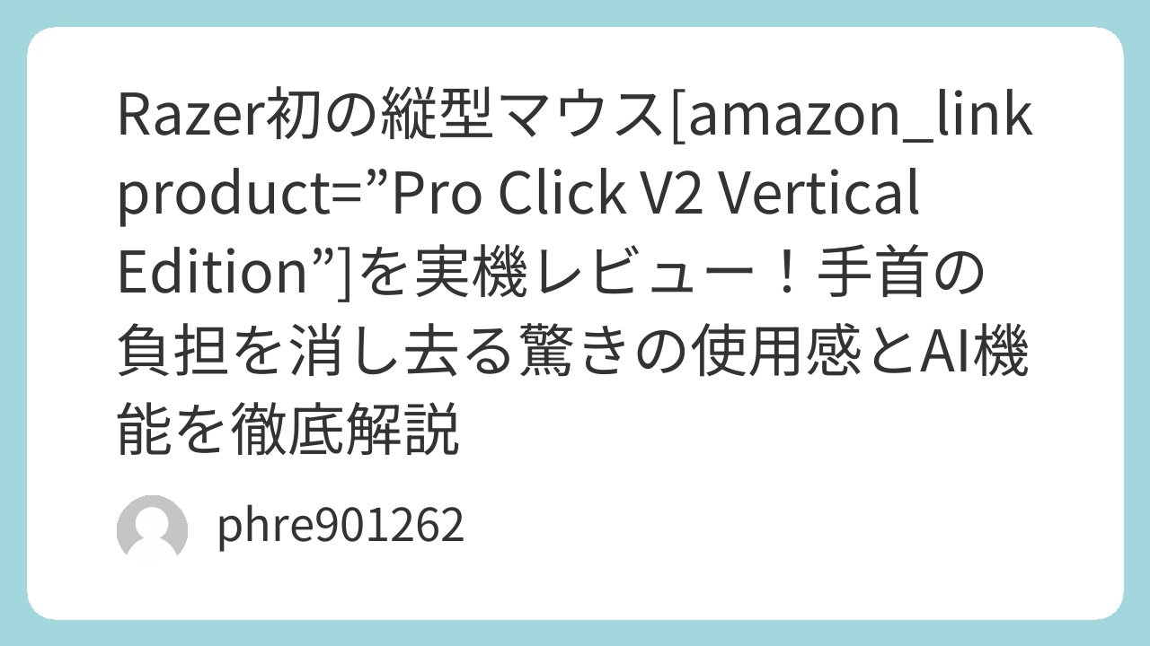 「Razerから、ついに縦型マウスが出る」――このニュースを聞いたとき、私を含めた多くのRazerファンが色めき立ったはずです。これまでの[amazon_link product=”DeathAdder”]や[amazon_link product=”Basilisk”]も確かにエルゴノミクス(人間工学)に基づいた設計でしたが、今回登場した[amazon_link product=”Pro Click V2 Vertical Edition”]は、それらとは一線を画す「完全な縦型」です。