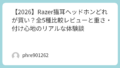 長時間のゲームプレイで気になるのが「重さ」です。確かに一般的なヘッドセットよりは存在感がありますが、[amazon_link product=”Razer”]特有の冷却ジェル注入型イヤークッション(モデルにより仕様は異なります)のおかげで、耳周りが熱くなりにくく、メガネをかけていても圧迫感が少ないのは嬉しいポイントでした。
