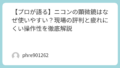 背面のジョイスティック一つで全ての設定が完結する操作性は、ストレスがありません。スタンドの高さ調整やスウィーベルも指一本で動くほどスムーズで、姿勢に合わせてミリ単位で位置を調整できるのは快感です。