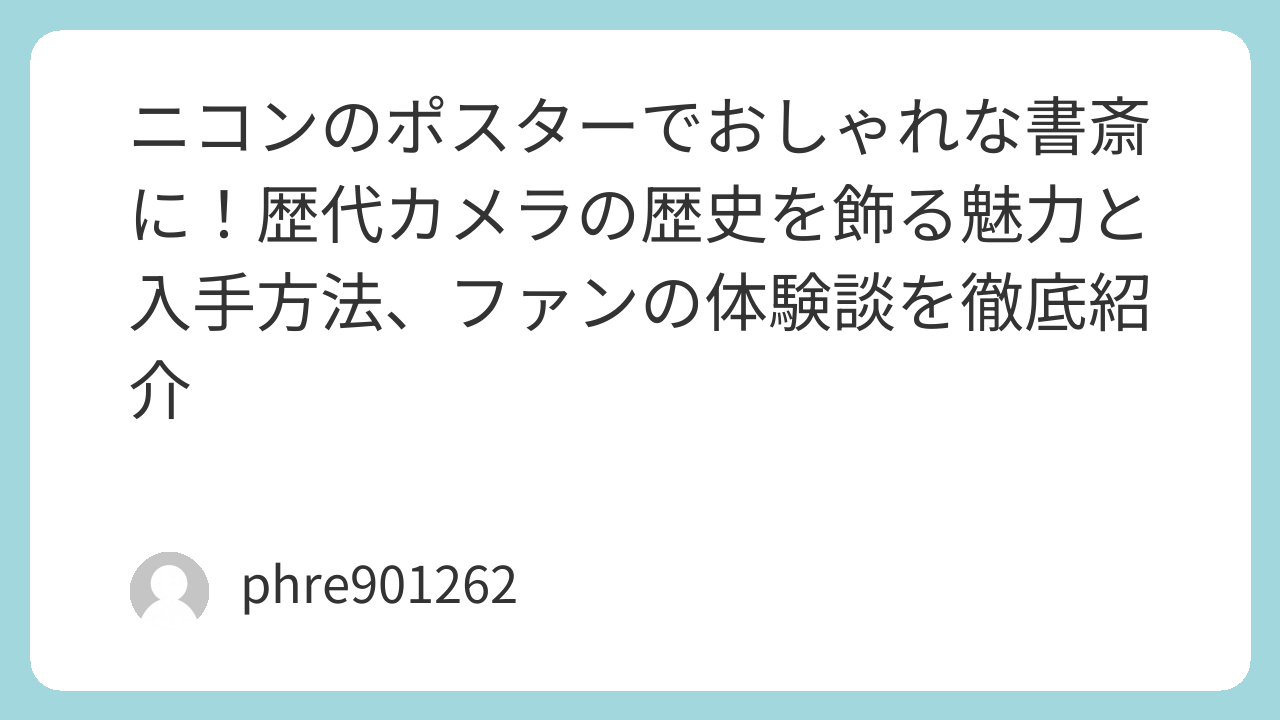 カメラに詳しくない家族がいる家庭では、メカメカしいポスターは敬遠されがちです。しかし、ニコンの100周年記念などで制作されたシンプルで洗練されたデザインのポスターなら、モダンなリビングにも驚くほど馴染みます。[amazon_link product=”ポスターフレーム A1 黒”]でビシッと引き締めれば、来客時に「これ、実はカメラのブランドなんだよ」と会話のきっかけにもなります。