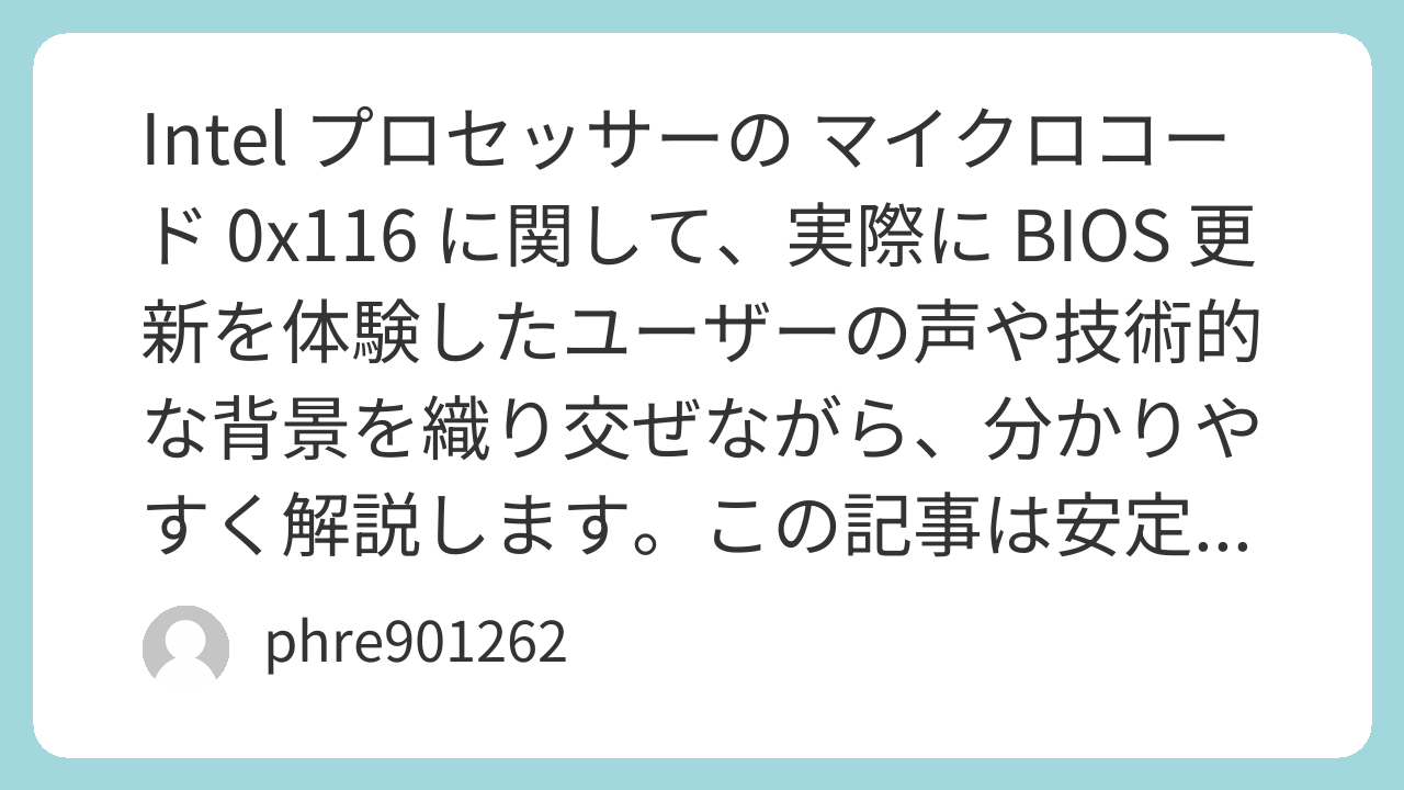 Intel プロセッサーの マイクロコード 0x116 に関して、実際に BIOS 更新を体験したユーザーの声や技術的な背景を織り交ぜながら、分かりやすく解説します。この記事は安定動作や大容量メモリでの互換性改善を求める PC 自作派や、最近 BIOS を更新した人に役立つ内容です。