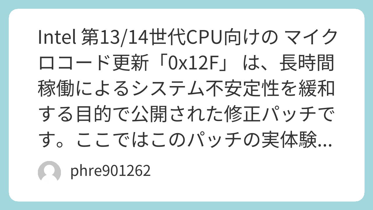 Intel の 0x12F マイクロコード更新は、13/14世代 CPU が抱えていた微妙な不安定性を改善する一手ですが、適用する際は各自の環境で慎重に検証しながら導入してください。(Tom’s Hardware)