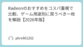 購入前でも購入後でも大事なのは、Radeonという名前だけで判断しないことです。CPU型番まで確認し、自分の使い方と照らし合わせる。このひと手間があるだけで、「思っていたのと違った」という失敗はかなり防ぎやすくなります。