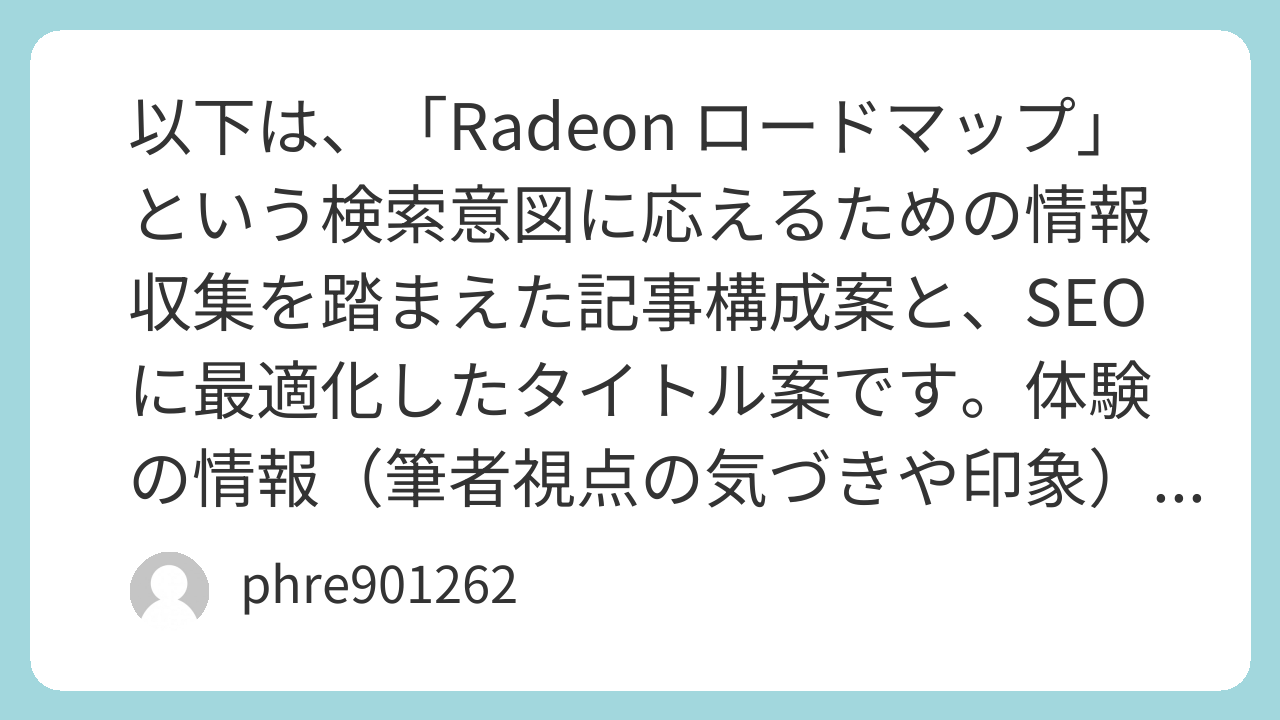 以下は、「Radeon ロードマップ」という検索意図に応えるための情報収集を踏まえた記事構成案と、SEOに最適化したタイトル案です。体験の情報(筆者視点の気づきや印象)も織り交ぜて構成を考えています。