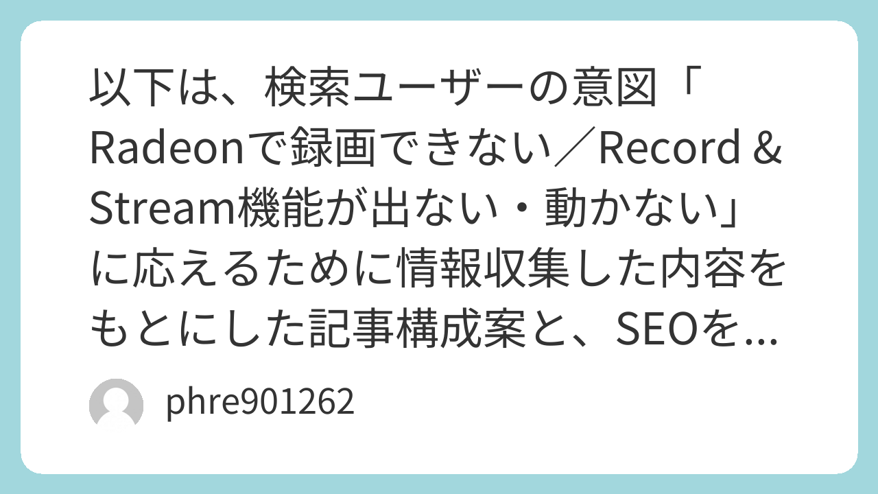 - Radeonの録画機能(Record&Stream/ReLive)の概要と、録画できない現象の一般的な症状(機能が表示されない、録画スタートするのに保存されない、黒画面/無音など)を明確化。