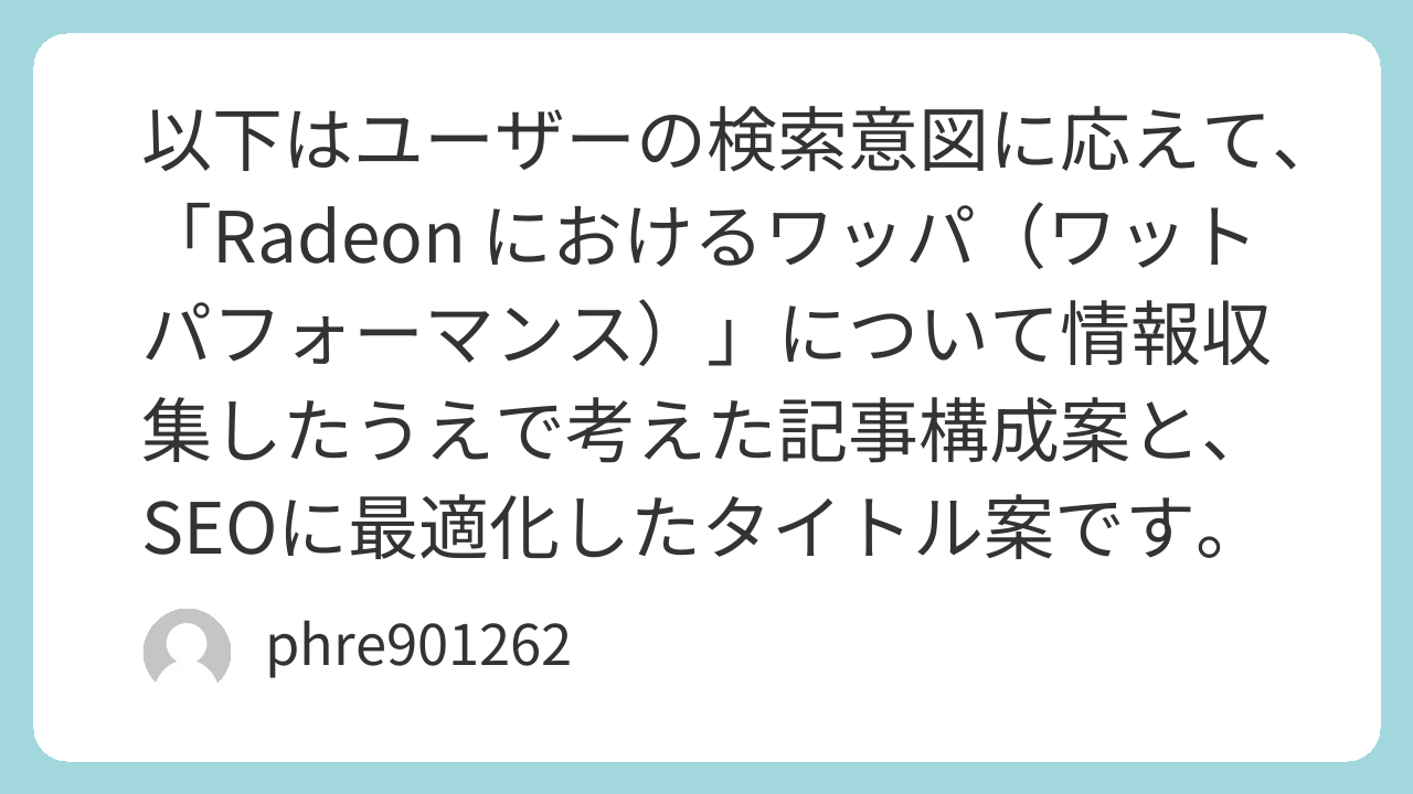 必要であれば、この記事を実際の体験談中心に肉付けした本文テンプレートも作成できます。 どのGPUの体験情報を重視したいか(例:RX 6600、RX 7800 XT、RX 9070 など)を教えてください。