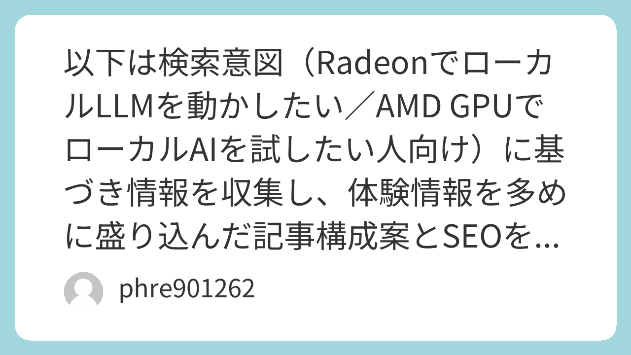 必要なら、この記事案を元に全文ドラフト(実体験入りの詳しい文章)も書けますよ。どのモデルの環境(Windows / Linux / 具体的な Radeon GPU)を対象にしたいかも教えてください。