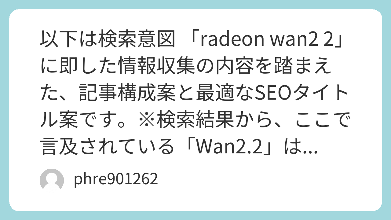 以下は検索意図 「radeon wan2 2」 に即した情報収集の内容を踏まえた、記事構成案と最適なSEOタイトル案です。※検索結果から、ここで言及されている「Wan2.2」は Alibaba が開発したAI動画生成モデル のことで、Radeon は GPUとの相性や実体験(筆者/コミュニティ報告)中心 の記事になるのが自然です。(株式会社一創 |)