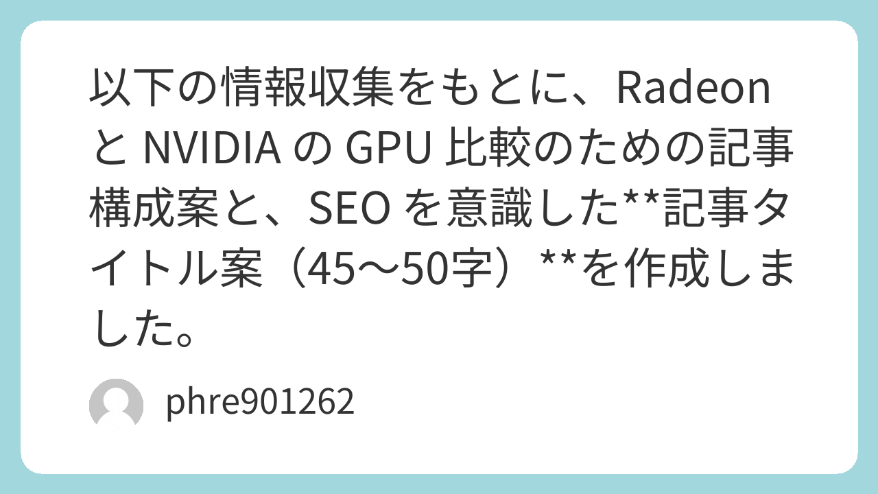 以下の情報収集をもとに、Radeon と NVIDIA の GPU 比較のための記事構成案と、SEO を意識した**記事タイトル案(45~50字)**を作成しました。