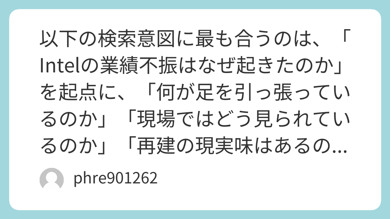 記事構成案は、冒頭で「Intel業績不振」の結論を先に示し、その後に原因を3層で分解する形がSEOに強いです。第1章で「Intel業績不振の現状」を数字で整理し、第2章で「なぜ不振なのか」をPC・データセンター・AI・Foundryの4本柱で解説、第3章で「現場の体験・導入目線」を入れ、第4章で「回復シナリオ」、最後に「今後の注目点」を置く流れが自然です。検索ユーザーは単なる決算要約ではなく、「もう終わった会社なのか、それとも再建できるのか」を知りたいので、原因分析だけで終わらず、再建余地まで書く設計が重要です。 (インテルダウンロード)