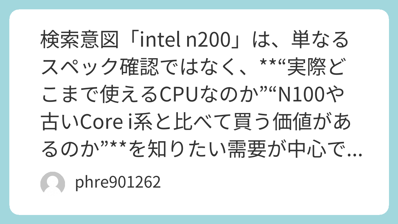 「intel n200 n100 違い」「intel n200 性能」「intel n200 できること」「intel n200 おすすめ用途」は自然に派生流入を狙えます。これは上記構成内で無理なく拾えます。 (インテル)