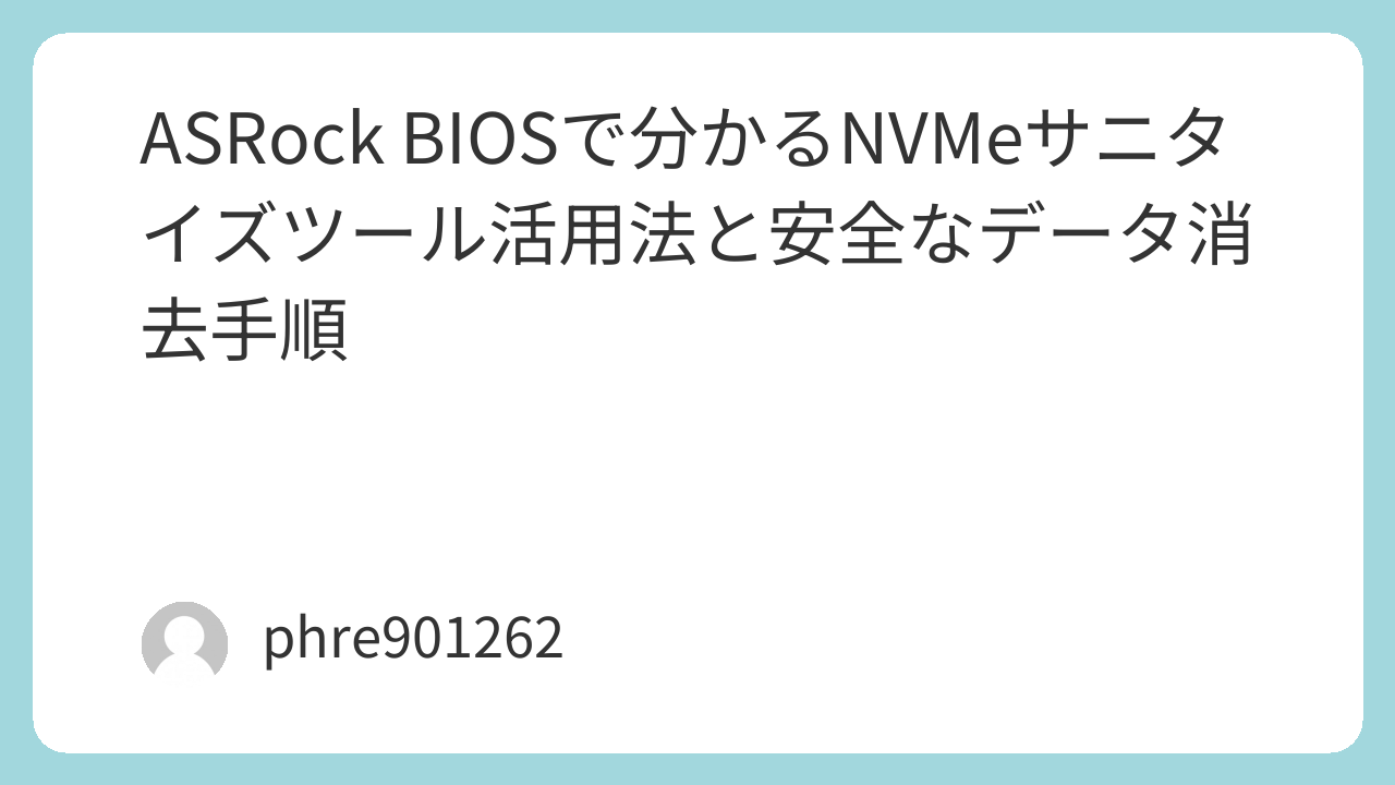 ASRock NVMeサニタイズツールは、ASRockのマザーボードに搭載されている、NVMe SSDを完全に消去するための機能です。このツールは、データを復旧不可能な形で消去するため、PCやサーバーで使われる大事なデータの取り扱いにおいて非常に役立ちます。サニタイズとフォーマットは異なり、サニタイズはSSDの全データを完全に消去するのに対して、フォーマットはパーティション情報を削除しますが、データ自体は消去しません【source】。