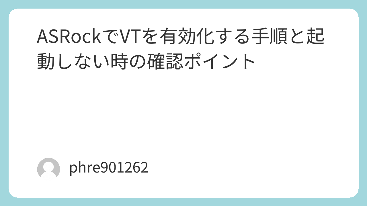 ASRockでVTを有効化する時は、IntelならIntel Virtualization Technology、AMDならSVM Modeを探すのが基本です。BIOSに入ってAdvancedからCPU関連の設定へ進み、Enabledに変更して保存すれば、流れとしてはそれほど複雑ではありません。
