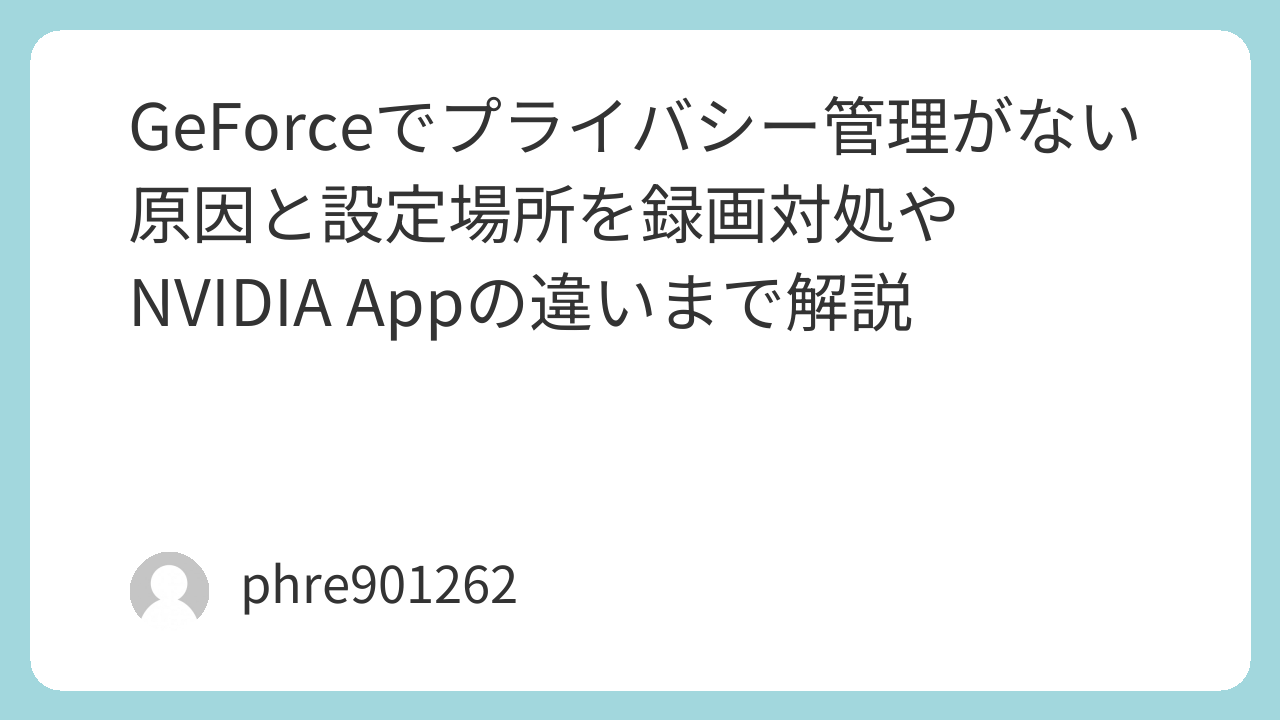GeForceで「プライバシー管理がない」と感じたら、まず旧GeForce Experienceの呼び方をそのまま探していないかを疑うべきです。今はNVIDIA App側で「Video capture」「Desktop capture」として扱われる場面があり、アカウントのPrivacy Centerとは別です。しかも、設定がまるごと見えない場合は既知の不具合、録画が途中で止まる場合はコピー保護コンテンツやDiscord配信の干渉という、原因の層が分かれています。ここを整理して見れば、闇雲に触るよりずっと早く答えに近づけます。 (NVIDIA サポート)