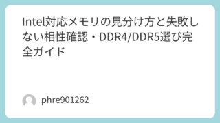 Intel対応メモリの見分け方と失敗しない相性確認・DDR4/DDR5選び完全ガイド Intel対応メモリを探していると、思った以上に情報が入り組んでいて戸惑いやすいです。CPUが対応していると書かれていても、実際にはマザーボード側の条件で使えなかったり、起動はしてもXMPを有効にした瞬間に不安定になったりすることがあります... 2026.03.16 未分類