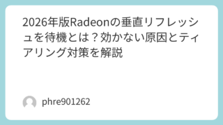 2026年版Radeonの垂直リフレッシュを待機とは?効かない原因とティアリング対策を解説 Radeonの「垂直リフレッシュを待機」とは何かの設定を見直していると、「垂直リフレッシュを待機」という少し分かりにくい項目に出会います。最初にこの表示を見たとき、正直なところ「待機って何を待つんだろう」と首をかしげました。名称だけでは役割... 2026.03.15 未分類