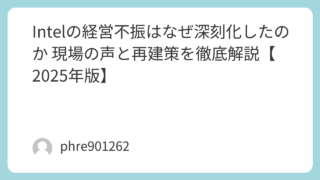 Intelの経営不振はなぜ深刻化したのか 現場の声と再建策を徹底解説【2025年版】 「Intelは昔ほど強くない」「最近は厳しいらしい」と聞いて、何となく気になって検索した人は多いはずです。実際、Intelは2024年通期で売上531億ドル、純損失188億ドルを計上し、大規模な人員削減方針まで打ち出しました。さらに2025... 2026.03.15 未分類