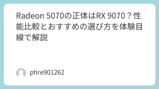 Radeon 5070の正体はRX 9070?性能比較とおすすめの選び方を体験目線で解説 「radeon 5070」で検索したものの、なかなか知りたい答えにたどり着けない。そんなもどかしさを感じた人は少なくないはずです。実際に調べていくと、正式な製品名としてのを探している人もいれば、に近い立ち位置のRadeonを知りたい人、ある... 2026.03.14 未分類