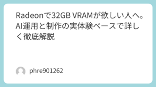Radeonで32GB VRAMが欲しい人へ。AI運用と制作の実体験ベースで詳しく徹底解説 Radeonで32GB VRAMを探す人が本当に知りたいこと「Radeon 32GB VRAM」で検索するとき、知りたいのは単なる型番一覧ではありません。実際には、「いま買える32GB級のRadeonは何か」「16GBでは苦しかった作業がど... 2026.03.14 未分類