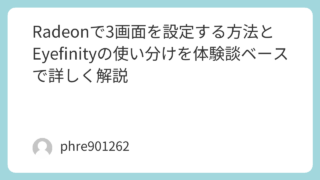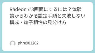 Radeonで3画面を設定する方法とEyefinityの使い分けを体験談ベースで詳しく解説 で3画面設定をしたい人が最初につまずくポイントで3画面環境を作ろうとすると、多くの人が最初に思うのは「3本つなげばそのまま映るはず」ということです。ところが、実際にはここで一度つまずきます。2枚まではすんなり映るのに、3枚目だけ真っ暗なまま... 2026.03.14 未分類