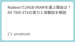 Radeonで24GB VRAMを選ぶ理由は?RX 7900 XTXの実力と体験談を解説 「radeon 24gb vram」で調べるとき、本当に知りたいこと「radeon 24gb vram」と検索するとき、ただスペック表を見たい人はそれほど多くありません。実際には、容量24GBのVRAMがどこまで役に立つのか、ゲームだけでな... 2026.03.14 未分類