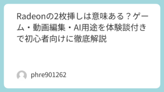 Radeonの2枚挿しは意味ある?ゲーム・動画編集・AI用途を体験談付きで初心者向けに徹底解説 「を2枚挿ししたら、単純に性能が2倍近くになるのでは」と考えたことがある人は少なくないはずです。自作PCに慣れてくると、1枚のGPUを上位モデルに買い替えるか、それとも同じGPUをもう1枚追加するかで悩む場面が出てきます。私も最初は、2枚挿... 2026.03.14 未分類